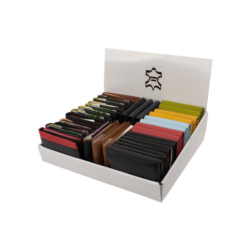 Theken-Verkaufsdisplay aus Karton bestückt mit 30 Stück Lederwaren Accessoires.